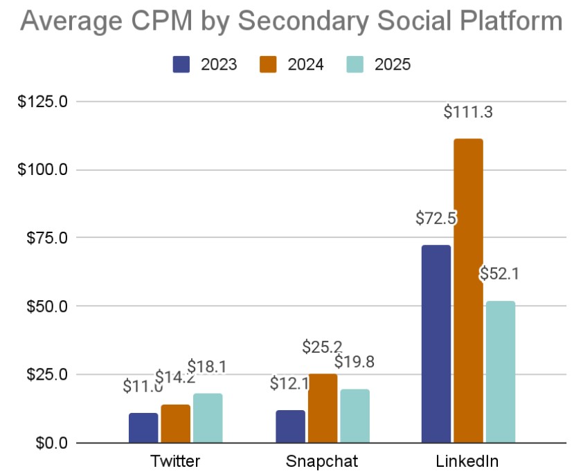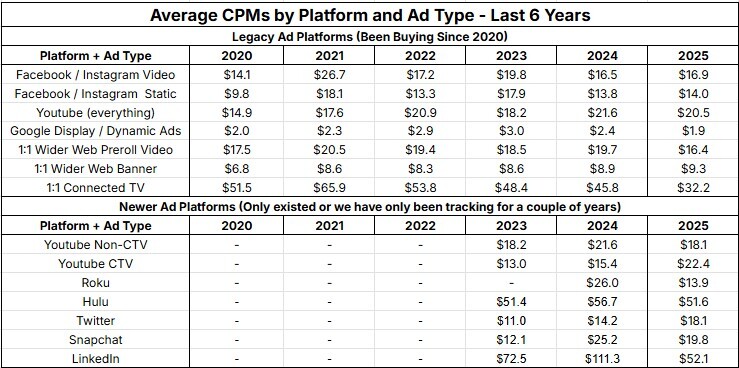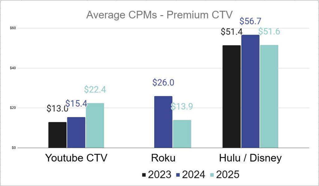 Roku Ads Manager CPMs nearly halved from 2025 to 2024 – and it was already ranking as one of our most efficient buys (Television quality media at the same price as Social ads? Yes please!). Meanwhile, Hulu / Disney prices reverted to 2023 prices after a significant increase in 2024. This may be a result of the Hulu Ads Manager becoming Disney Ads Manager, with more Disney supply coming into the market to take the aggregate price down.