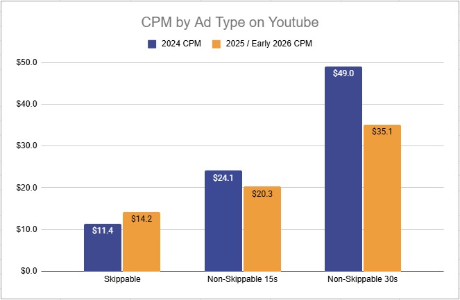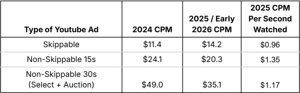 Cutting through the price fluctuations noise across the many types of Youtube – at the aggregate level, Youtube CPMs dropped 5% from 2024 to 2025 (from $21.6 to $20.5), even as more valuable media (30s Non-Skip) began to enter the auction. That’s good news for advertisers adapting to YouTube’s increasing market share (about 2% more of TV-style media watching occurs on Youtube Main than it did in November 2024, according to Nielsen).