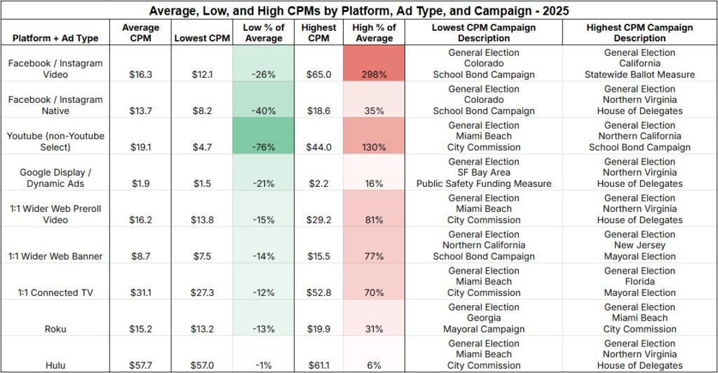 That’s why we like to share these annual price trend updates – we believe that getting these gritty details right leads directly to more votes won from paid media campaigns. As part of our ongoing effort to monitor media efficiency, we’ve completed our annual review of CPM trends, and we are ready to share so you can benefit from our insights too. The following data is compiled from the 111 campaigns we ran last year, augmenting the rest of our data and analysis dating dating back to 2020.